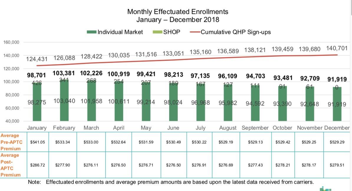 Next up: Average monthly strong>effectuated enrollments and premiums. Effectuated enrollments are the number of people actually paid for in active policies each month. This is different from the number of people who sign up for a policy, since a) not everyone who signs up actually pays their first premium, and every month some people drop their coverage for one reason or another while other new people sign up. In addition, there's a delay of as long as two months between the day you sign up for a policy and when it actually goes into effect.