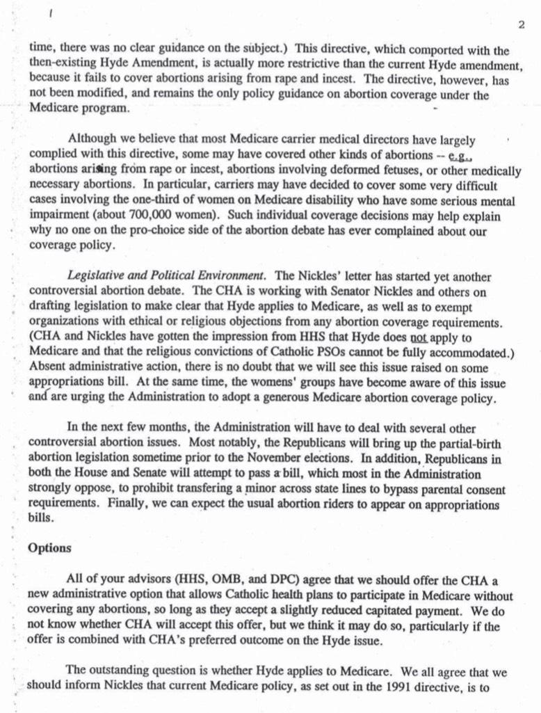 President Clinton ultimately approved "Option 1", which used a strict interpretation of Hyde for Medicare enrollees. As noted in the memo, this was less restrictive than the prior directive (life of the mother only) but more restrictive than how it had apparently been handled up until that point (life of the mother, health of the mother, rape, incest, deformed fetuses & mentally impaired mothers (the full memo clarifies that there were 700,000 seriously mentally impaired women of childbearing age on Medicare at the time...which means if they were pregnant, it would have to be due to their being raped).