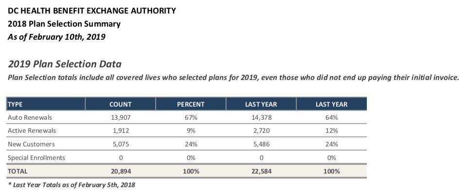 Until now, I've been missing the final 2019 Open Enrollment Period numbers for two state-based exchanges: Vermont and the District of Columbia. VT is still radio silent, but last night the DC exchange authority held their monthly meeting and released their latest data report.