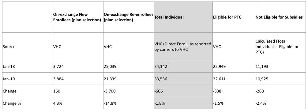 OK, so what's going on here? Well, on the surface, there were a total of 25,223 exchange-based QHP selections...down 12.3% year over year, or 3,540 people. Not good...in fact, this puts Vermont near the bottom of the list in terms of year over year performance, ahead of just Louisiana, West Virginia and Virginia. New enrollments are actually up 4.3% but re-enrollees are down 14.8%. Ouch.