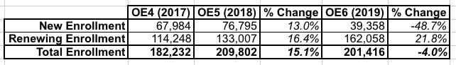 A 4% drop may sound bad, but total QHP selections during OE6 were actually down 8.3% year over year (from 243K to 223K), so this is actually an improvement in that sense. 90.5% of those who selected policies are still effectuated as of February this year vs. 86.4% as of February in 2018.