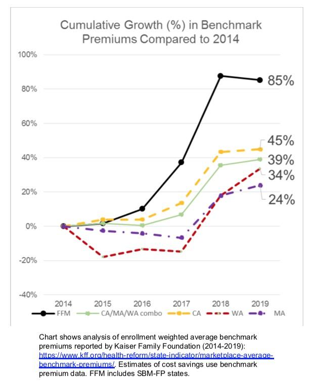 The report examined the cost of coverage by comparing the average benchmark premium in three states and the FFM between 2014 and 2019. The weighted average increase in California, Massachusetts and Washington was 39 percent, compared to the 85 percent increase in FFM states.