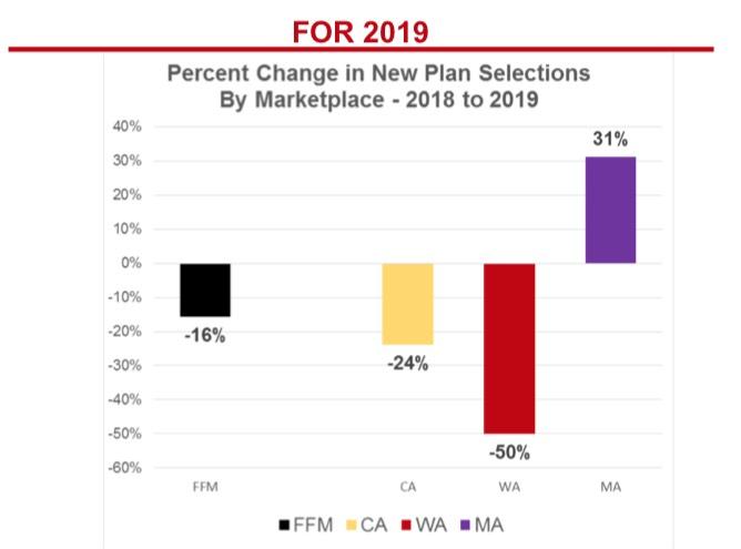 - Cumulative premium increases in California, Massachusetts and Washington are less than half of the increases seen in FFM states, but 2019 premium increases spiked in California and Washington compared to Massachusetts, which continued its state-based penalty.