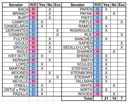 Hey, imagine that! All 14 "No" votes were Republicans, while all 21 "Yes" votes were Democrats! (Another 5 Dems and 2 GOP senators didn't vote at all).