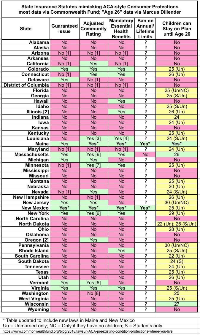 I've modified it to include the Maine and New Mexico laws, and have also added two more columns: One on the Annual/Lifetime Limit prohibition (which is mostly blank for now since I don't know the status in most states); the other is for states allowing adult children to stay on their parents plan until they turn 26 years old. This data comes from a 2014 abstract in the Journal of Health Economics by Marcus Dillender: