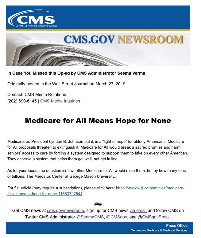 I'm not sure exactly what sort of "bolstering of her public profile" these taxpayer-funded GOP image consultants are doing, but I'd imagine it's crap like sending out promotional mailers like this one which showed up in my in box the yesterday...sent from the official CMS Press Office:
