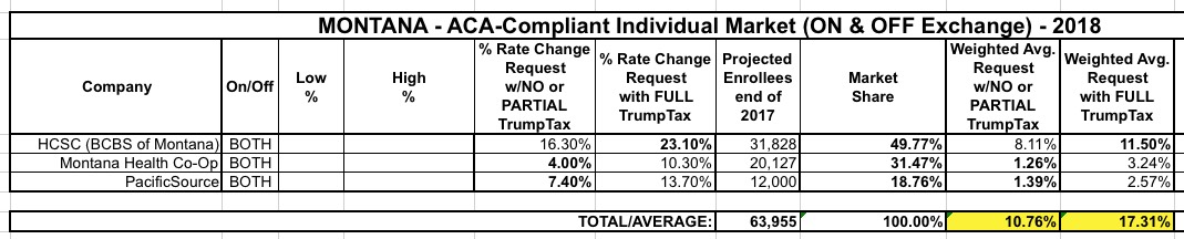 CORRECTION: I've been informed that unlike the other two carriers, BCBSMT's 23.1% request assumes that CSR payments won't be made. This dramatically lowers both weighted averages, to just 7.7% without a TrumpTax or 20.7% with the TrumpTax.