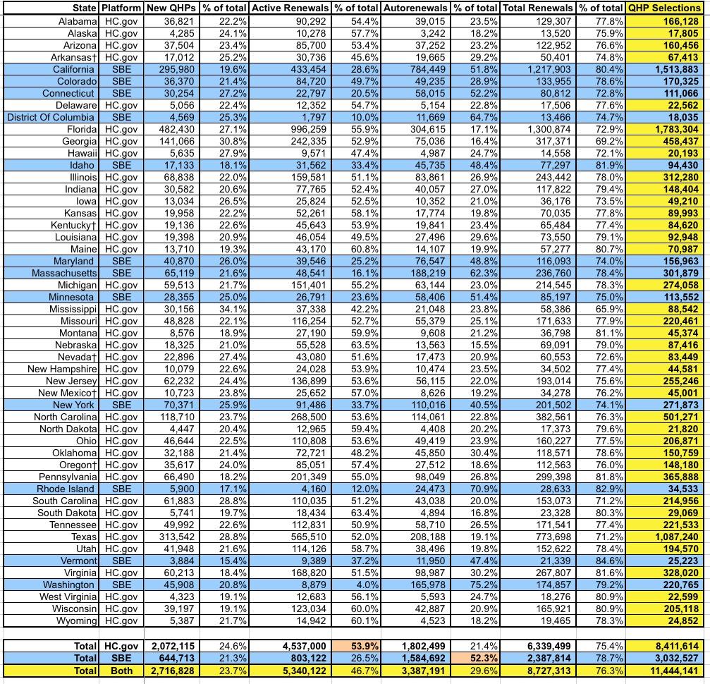 Looking at HealthCare.Gov states: The 4.3 million figure from 12/09 - 12/15 makes it look like over half of the enrollments happened in Week 7, but this is skewed because around 1.8 million auto-renewals on HC.gov states were added into the system that week. It's also worth noting that the longer enrollment period added around 7.3% to the total enrollments in the state-based exchanges...although not all of those states extended their deadlines either, so the actual impact was likely closer to 10%, I'd guess.