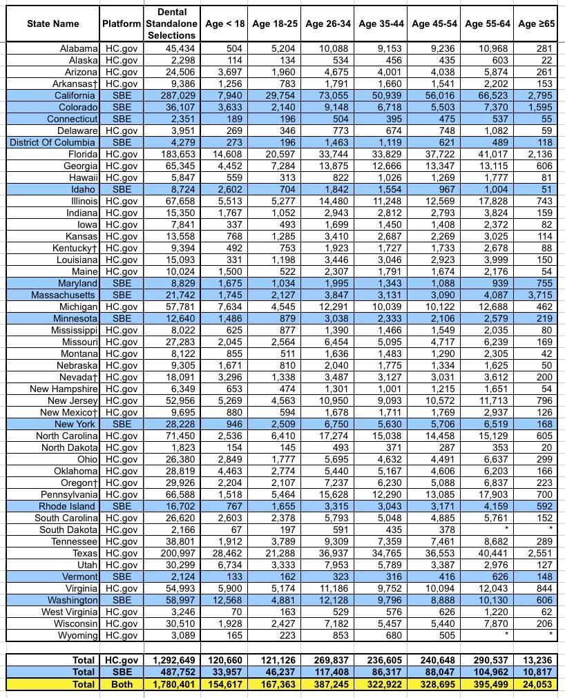 There's a whole bunch of other spreadsheets included in the PUF, but this is getting absurdly long so I'll just add one more: Standalone dental plan enrollments, which most analysts (including myself, I admit) have a tendency to ignore: