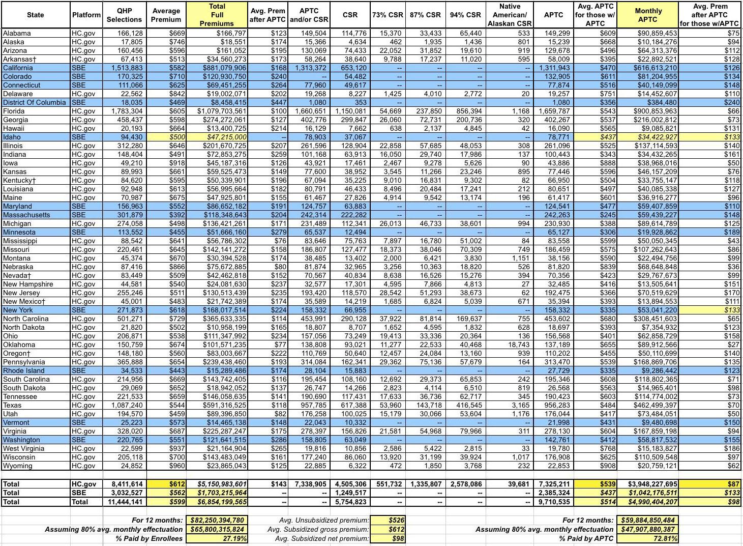 Here's the Big One (click image for the full-sized version). I've added two columns to it as well as as filling in a few fields which the CMS report left blank for whatever reason (espeically Idaho...I got their average unsubsidized premium from the YourHealthIdaho.org executive board meeting minutes, which allowed me to fill in a few other fields as well):