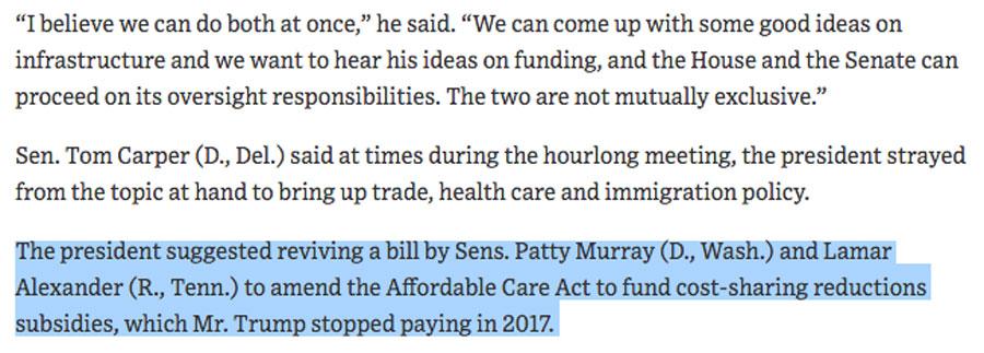 The only thing which surprised me about this development is that Trump himself...the same guy who cut off CSR payments in the first place, stiffing federal contractors for billions of dollars, is the one to pull a 180 and now push to reinstate them. I figured it'd be either Mitch McConnell or Kevin McCarthy...but Trump is known for completely changing his mind within the same sentence, so I guess this makes sense after all.