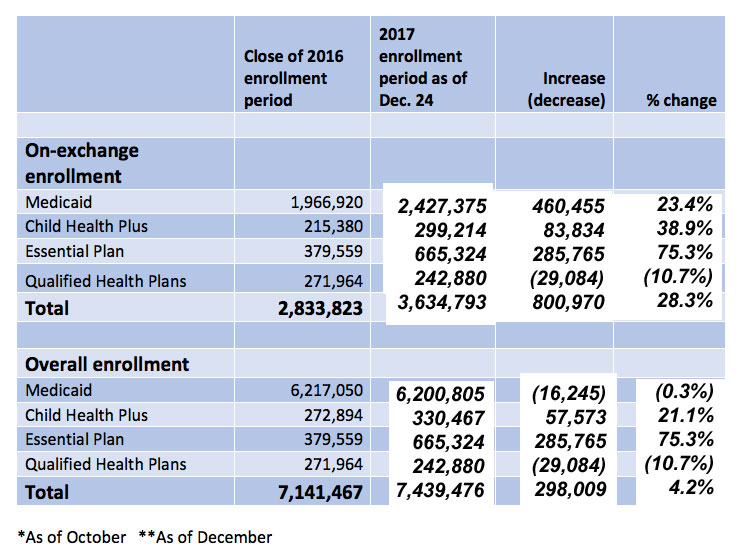 ALBANY, N.Y. (February 1, 2017) -- NY State of Health, the state’s official health plan Marketplace, today announced that more than 3.6 million New Yorkers enrolled in comprehensive health coverage through NY State of Health, a 28 percent increase from 2016.