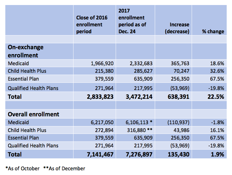 ...The reason for the discrepancy is that DOH’s release counted only sign-ups through the exchange, which handles less than half of the enrollment for the relevant programs. When off-exchange enrollment is included, the picture changes dramatically, as shown in the chart below.