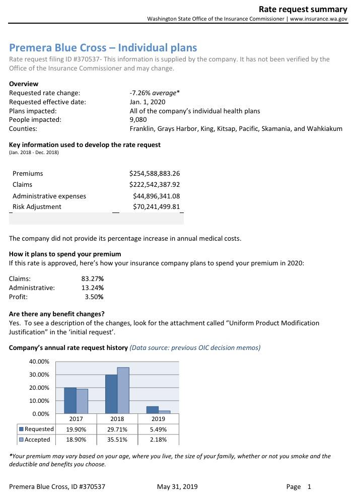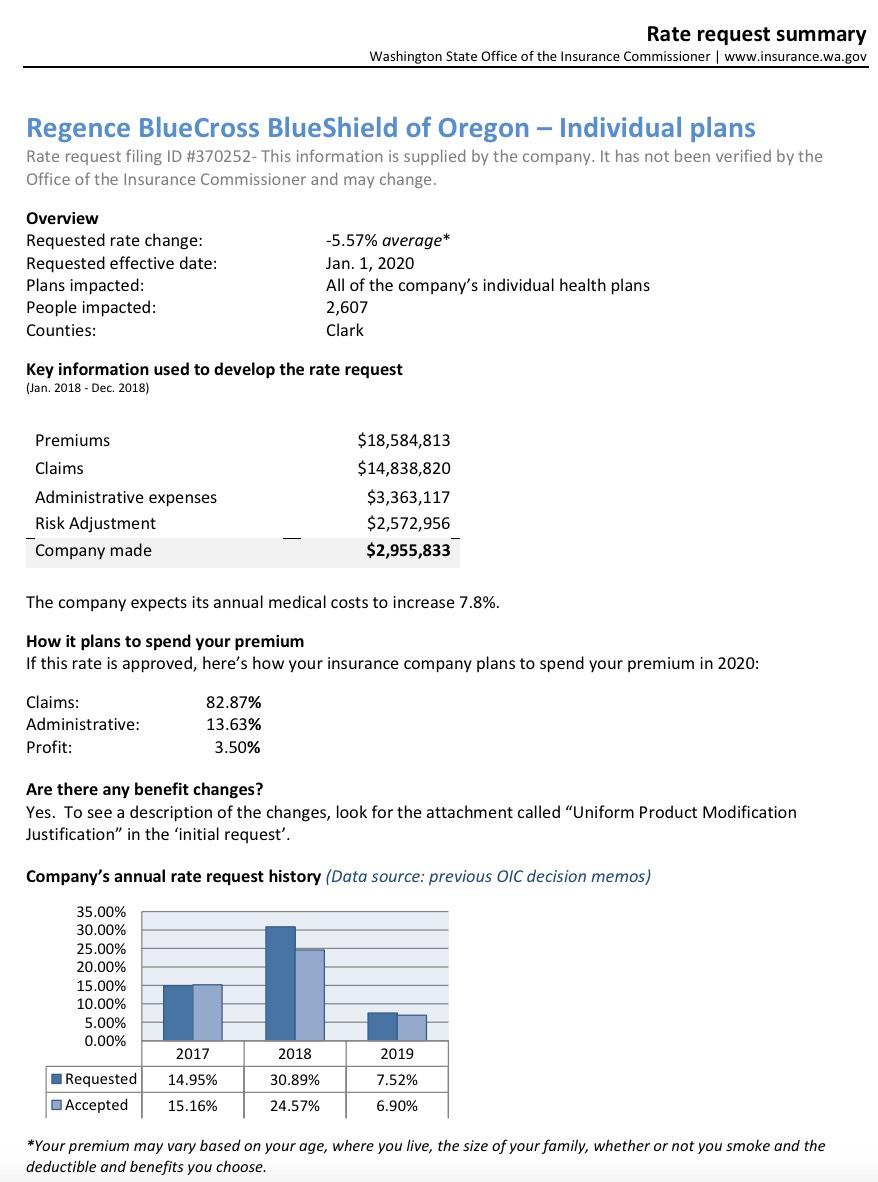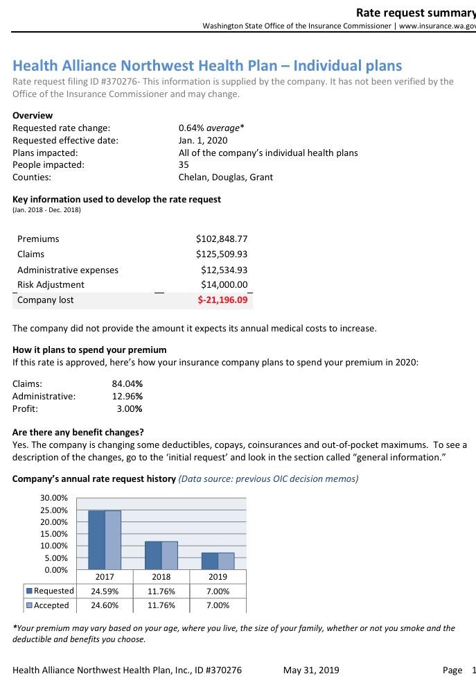 When I plug the hard numbers in from all of the insurers based on the rate filing summaries, I get a slightly higher weighted average of 1.43% instead of 0.96%, but that's pretty nominal and could be accounted for by several factors. Also, the grand total enrollment comes in at just 214,000 instead of the 248,000 noted in the press release; I'm not sure where the other 34,000 enrollees are...perhaps they're the last remnants of grandfathered plan enrollees? I did see one 2020 filing listing 6,300 enrollees in grandfathered LifeWise policies; it's possible that the other 28,000 or so are in grandfathered policies which aren't being renewed.