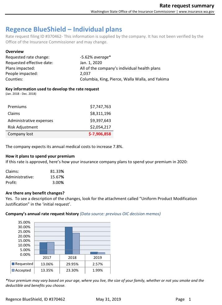 Washington State: PRELIMINARY 2020 ACA Exchange Premium Rate Changes: 1.0% increase