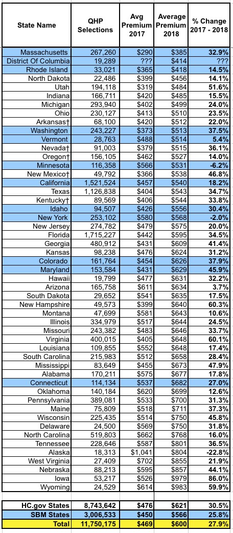 Yep, it hadn't really occurred to me before, but I double-checked the official 2018 CMS Public Use File, and sure enough, when you check Tab 5 (which lists stuff like average premiums, APTC subsidies, CSR assistance and so on) and sort the states by "Average Premium", voila: Massachusetts, average premium per enrollee before ACA subsidies: $385/month.
