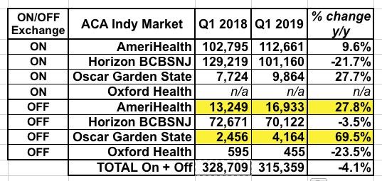 As an aside, here's a side by side comparison of the market share breakout for both years. Oxford is a non-entity (they're off-exchange only and only have a few hundred people enrolled in either year anyway). The noteworthy takeaway is that both AmeriHealth and Oscar saw substantial enrollment increases (both on and off-exchange) even as Horizon BCBSNJ saw a whopping 22% drop on exchange but only 3.5% off-exchange. Silver switching likely accounts for some of this as well.