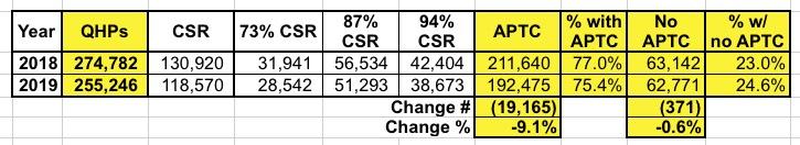 - First, this doesn't include off-exchange enrollment. In Q1 2018, they had around 89,000 effectuated off-exchange QHP enrollees. If the Q1 2019 off-exchange number also drops significantly, then the odds are that the reinstated mandate penalty went either unknown or unheeded. If it holds close to 89K, on the other hand, that suggests that a decent number of unsubsidized enrollees did enroll (grudgingly, perhaps) due to the mandate still being around. You'd really have to compare this with the off-exchange impact in other states as well, however.