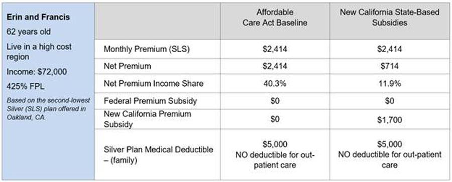 As an example, a 62-year old couple in Oakland who earn $72,000 a year currently are not eligible for any financial help. Under the new state subsidy program, they could receive $1,700 per month in financial help, which would cover 70 percent of their monthly premium (see Table 1: New State Subsidy Scenario).