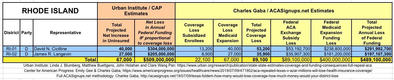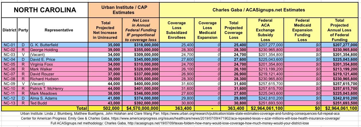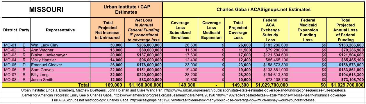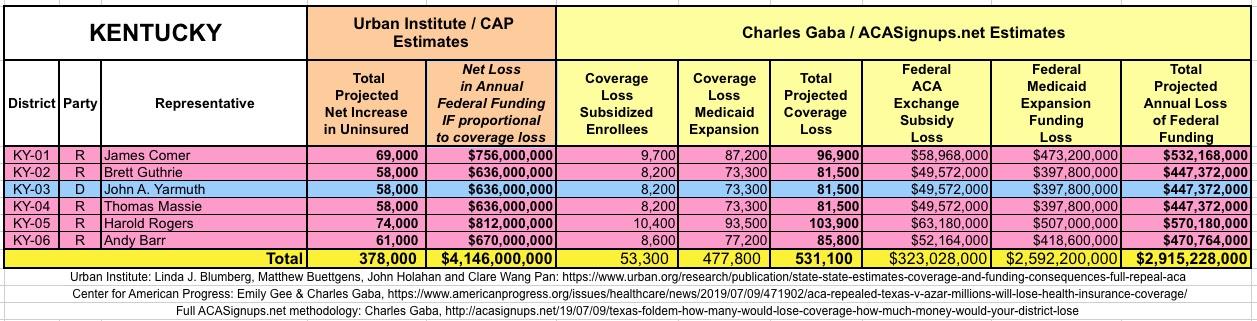 The Urban/CAP numbers are probably more accurate, but mine have one advantage: I've broken out both the coverage losses and funding losses by category (Individual Exchange Market/BHP and Medicaid Expansion). In addition, I've color-coded the Congressional Districts by which party each U.S. Representative is a member of.