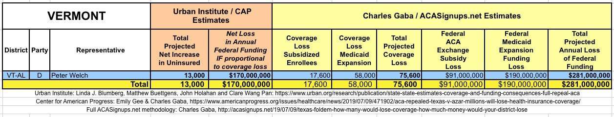 In March 2019, Linda J. Blumberg, Matthew Buettgens, John Holahan and Clare Wang Pan of the Urban Institute ran a detailed analysis to determine what the impact on healthcare coverage would be in every state if the Texas vs. U.S. lawsuit (aka Texas vs. Azar or #TexasFoldEm) caused the Patient Protection & Affordable Care Act (ACA) to be repealed with immediate effect.