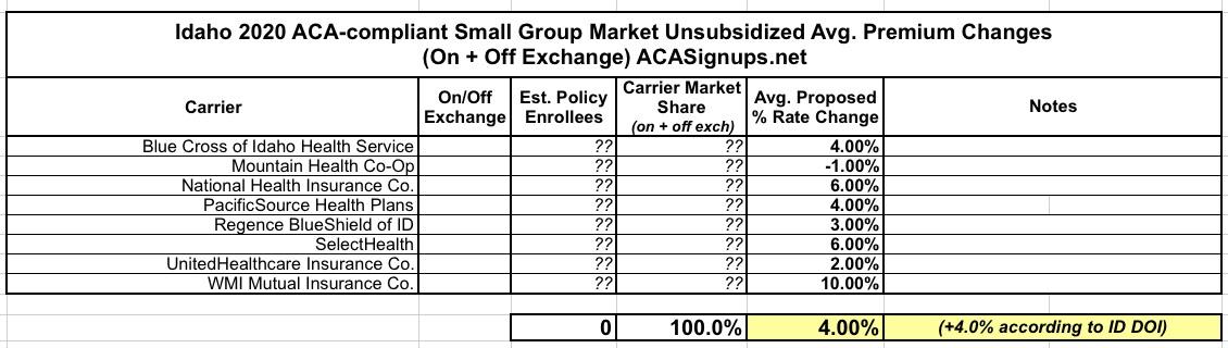 Idaho's DOI does a nice job of breaking out the rate h ikes by metal level, and the addition of the prior years' premiums/claims is a nice touch. Unfortunately, while they do include links to the filing summaries, one of them is missing (Regence BlueShield), and the one for Blue Cross doesn't give a hard enrollment number, making it difficult to plug in the relative market share for each carrier. For now I'm using the 2018 enrollment numbers for these two in the hope that their enrollment numbers stayed relatively stable (Idaho's exchange enrollment was virtually unchanged year over year, for instance).