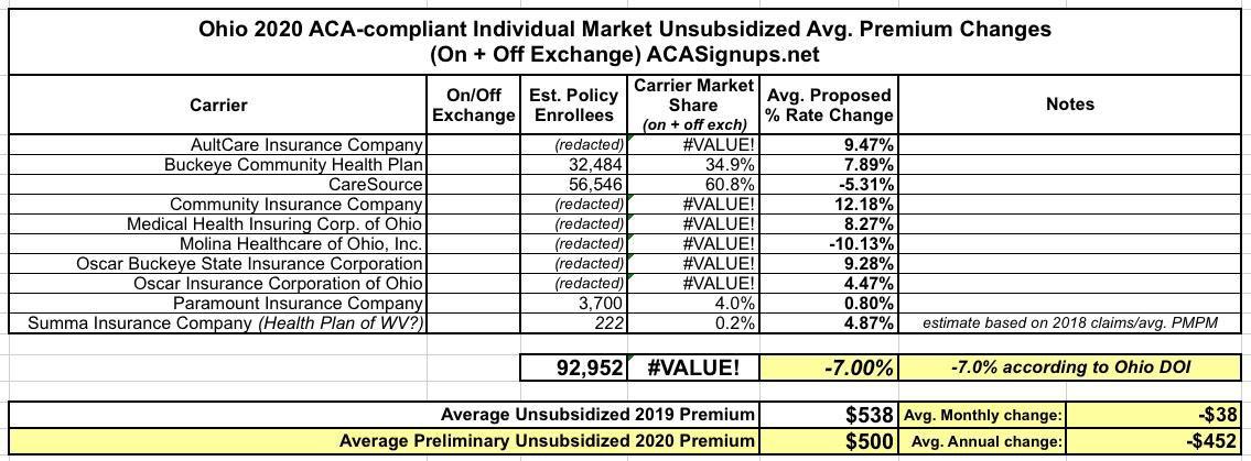 UPDATE: Ohio: Preliminary 2020 #ACA exchange avg. rate changes: 7.0% *decrease*
