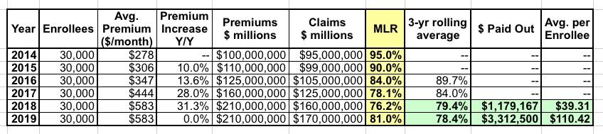 Their MLR was way too high the first two years...in fact, they lost money in 2014 and probably in 2015 as well, since administrative overhead/etc. costs more than 5%. Things started to stabilize in 2016, and in 2017 they actually overshot the mark slightly. In 2018 they seriously overpriced, so they instituted a price freeze in 2019 to try and comply with the ACA's 80% MLR rule.
