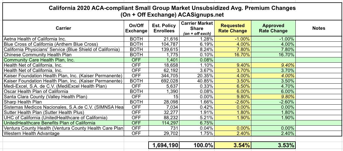 Oh, I was also able to use the DMHC database to put together California's small group market increases, which are averaging 3.5% in 2020: