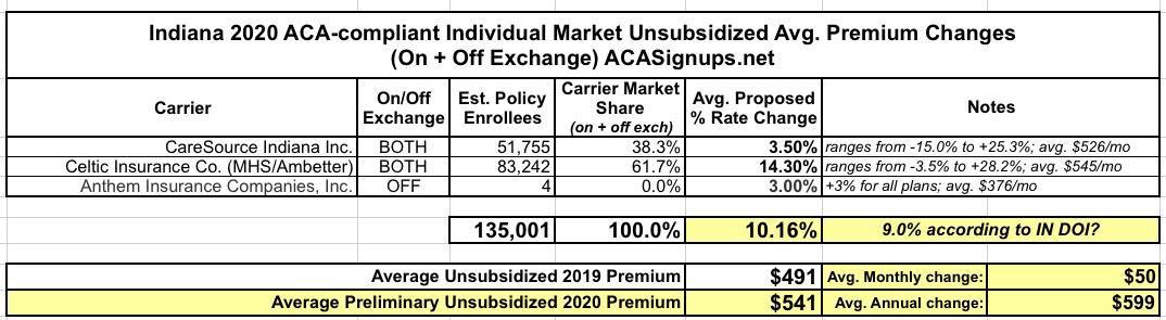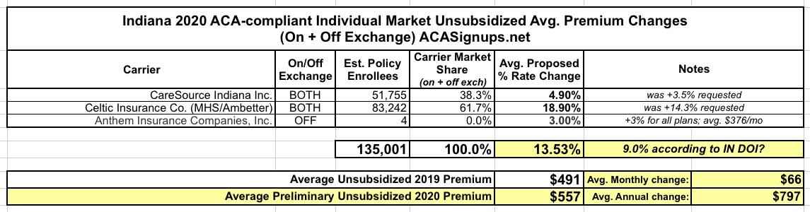Back in early July, the Indiana Insurance Dept. posted the preliminary requested 2020 rate increases for the carriers participating in the ACA-compliant individual market. Technically there's three carriers there (CareSource Indiana, Celtic/Ambetter and Anthem), though Anthem only has 4 (yes, four) people enrolled in off-exchange policies total.