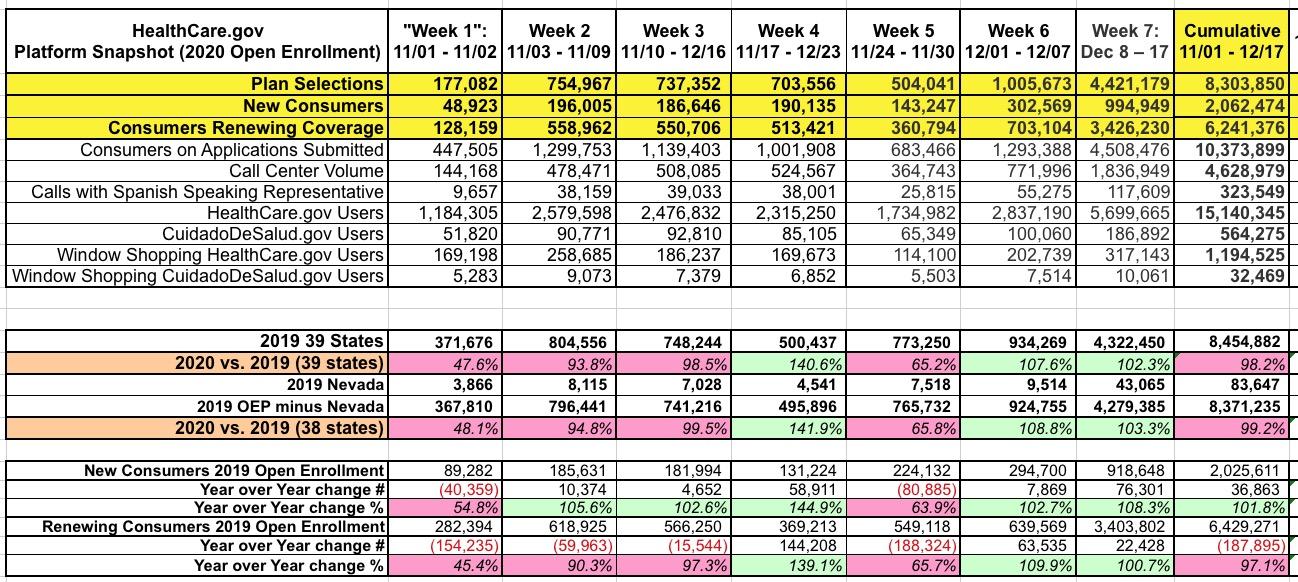 Here's the week by week breakout across all 38 states. I've also compared the 2020 Open Enrollment numbers against the 2019 data, and have even accounted for the fact that Nevada split off onto their own state-based exchange this year: