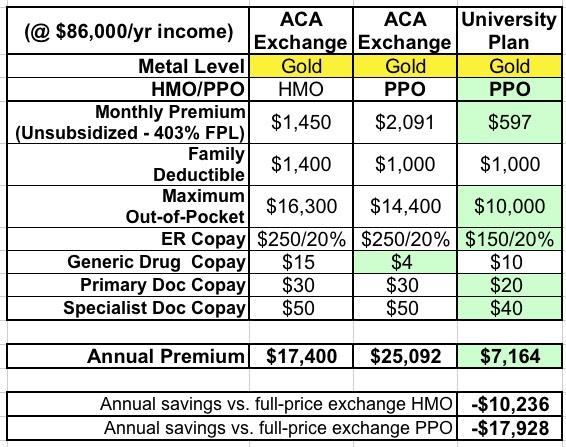 • Unsubsidized ACA Exchange Gold HMO (BCN): $1,486/month
