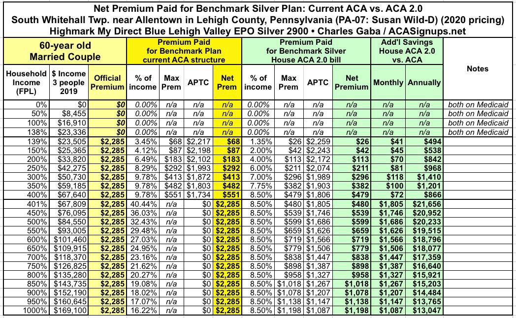 Under ACA 2.0, again, they'd pay no more than 8.5% in premiums, reducing their net premiums from $2,285/month down to as little as $480/month, a reduction of a whopping $1,805/month or over $21,600/year.