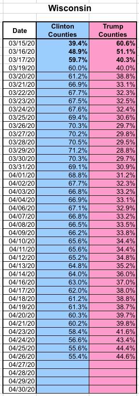 The same pattern can be seen at almost the same slope when I divide up the cases into Blue (voted for Hillary Clinton in 2016) and Red (voted for Donald Trump) counties: The Red counties have increased from 29% of all cases to nearly 45% in just 4 weeks: