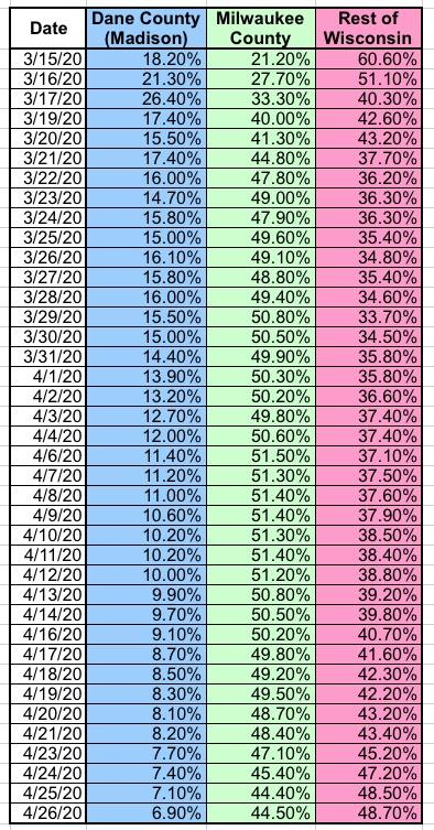 After holding steady at about 1/3 of all Wisconsin cases for the first week or so, rural Wisconsin (or at least "Not Milwaukee/Dane County" Wisconsin) has seen positive tests grow over the past month until it's now nearly a 50/50 split.