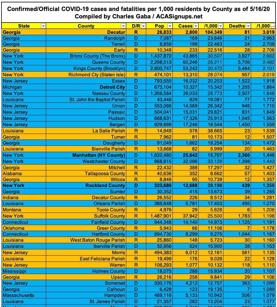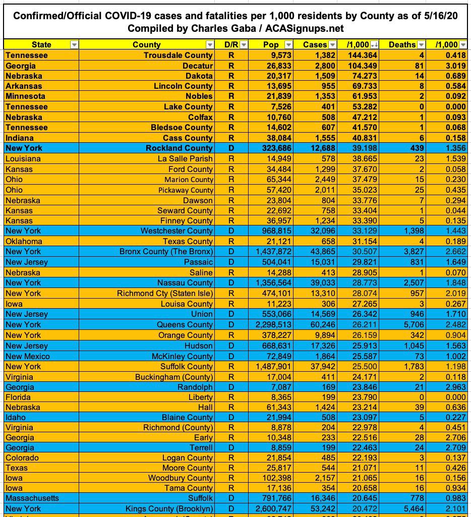 As you can see, on a per capita basis, the 9 counties with the highest rate of confirmed COVID-19 infections in the country all voted for Trump, and 8 of the 9 are in states which Trump won. Most of these appear to feature either prisons, meat packing plants or both. The blue county which currently ranks highest on the list is Rockland County, New York.