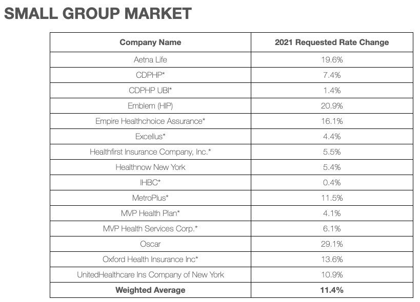 New York: Preliminary avg. 2021 #ACA premiums: 11.7% increase for indy market, 11.4% for sm. group