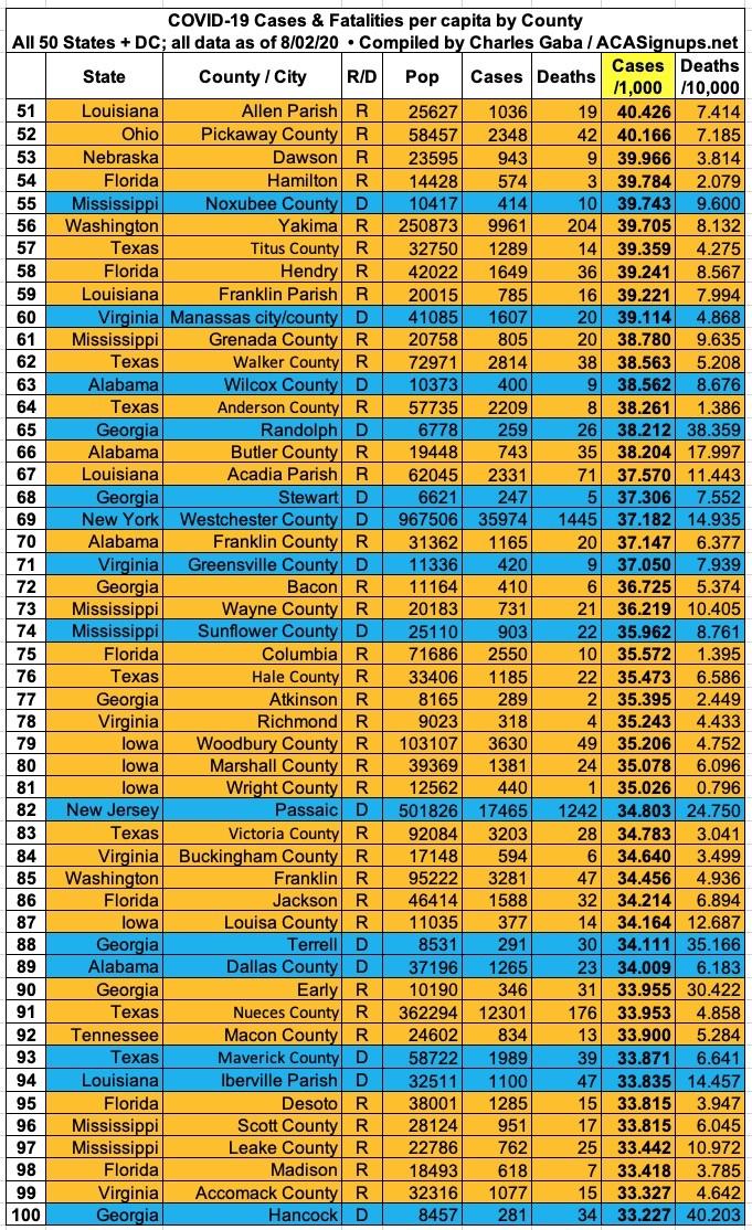 Here's the top 100 counties ranked by per capita COVID-19 cases as of Saturday, August 1st (click image for high-res version):
