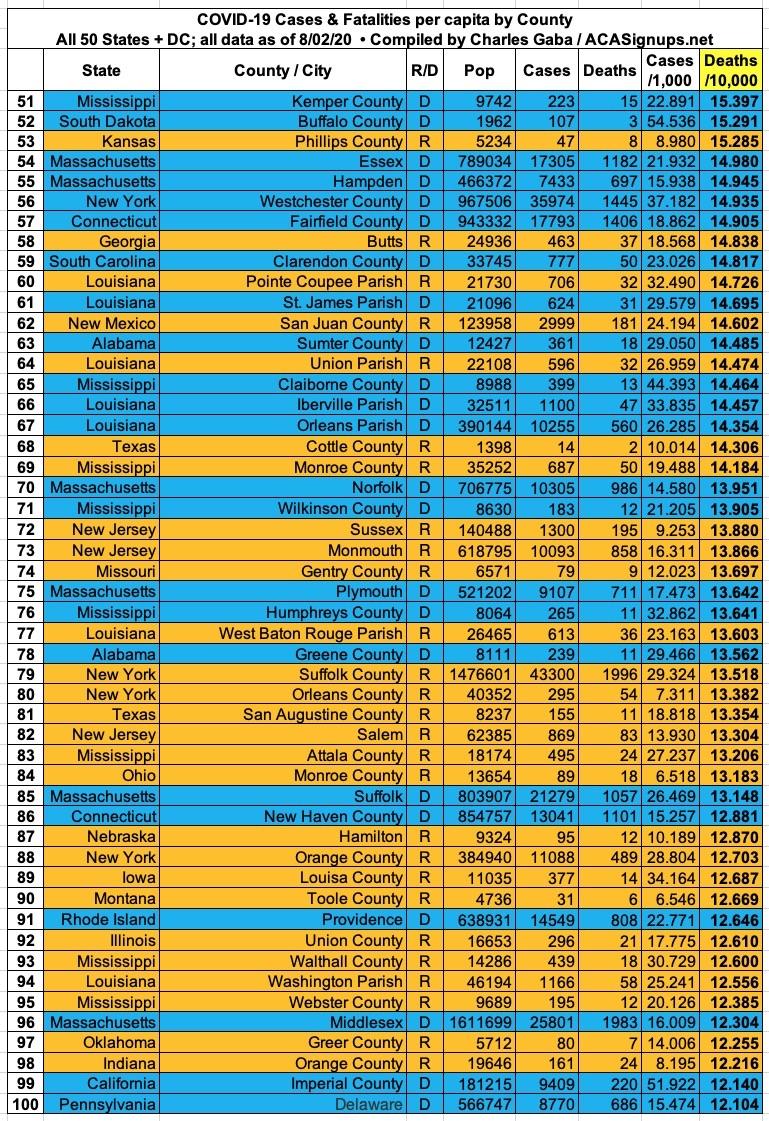 Here's the top 100 counties ranked by per capita COVID-19 fatalities as of Saturday, August 1st (click image for high-res version):