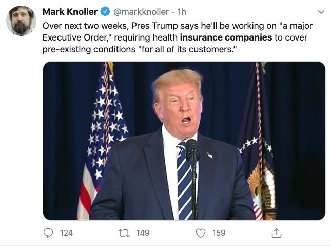 ANY reporter/media outlet which reports/tweets about Trump's XO "ordering" insurance companies to "cover pre-existing conditions" without mentioning that THE ACA ALREADY DOES THIS and TRUMP IS SUING TO STRIKE DOWN THE ACA is guilty of journalistic malpractice.