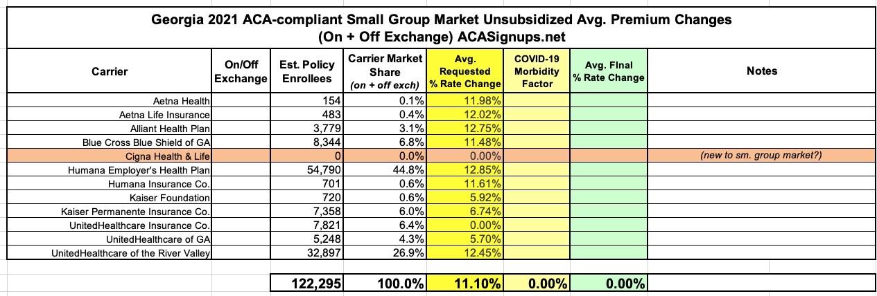 As you can see in the tables at the bottom of this entry, the overall weighted rate change requested by individual market carriers in Georgia is a 1.3% reduction, which would have been more like a 2.3% drop if not for the COVID-19 factor, according to the carriers. The small group market carriers are requesting an 11.1% average increase, which is unusually high these days. I haven't reviewed all the memos for the sm. group market to see what they're pinning on COVID-19, however.