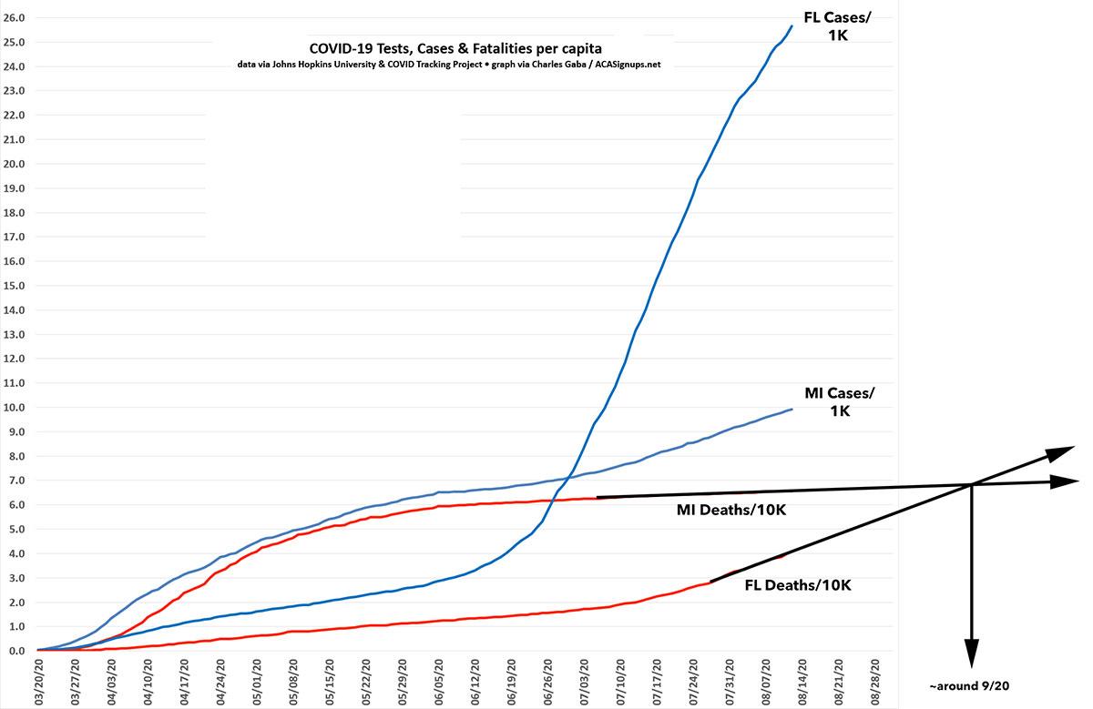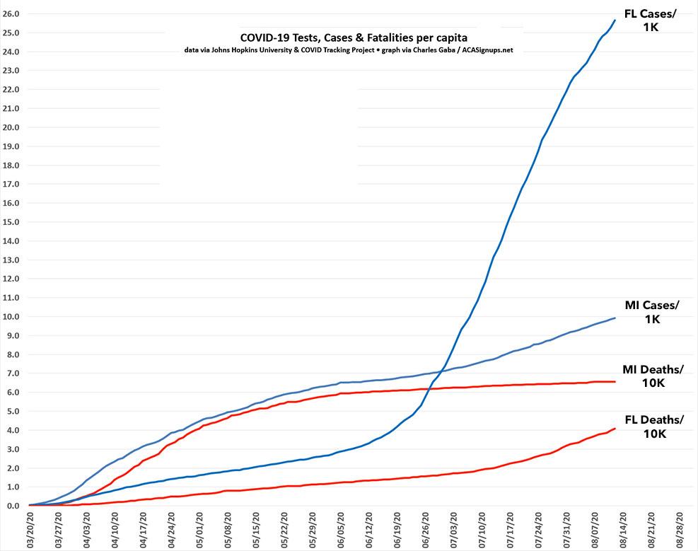 As you can see, while COVID-19 cases are now far higher per capita in Florida than in Michigan, deaths per capita are still considerably higher in Michigan...so far.
