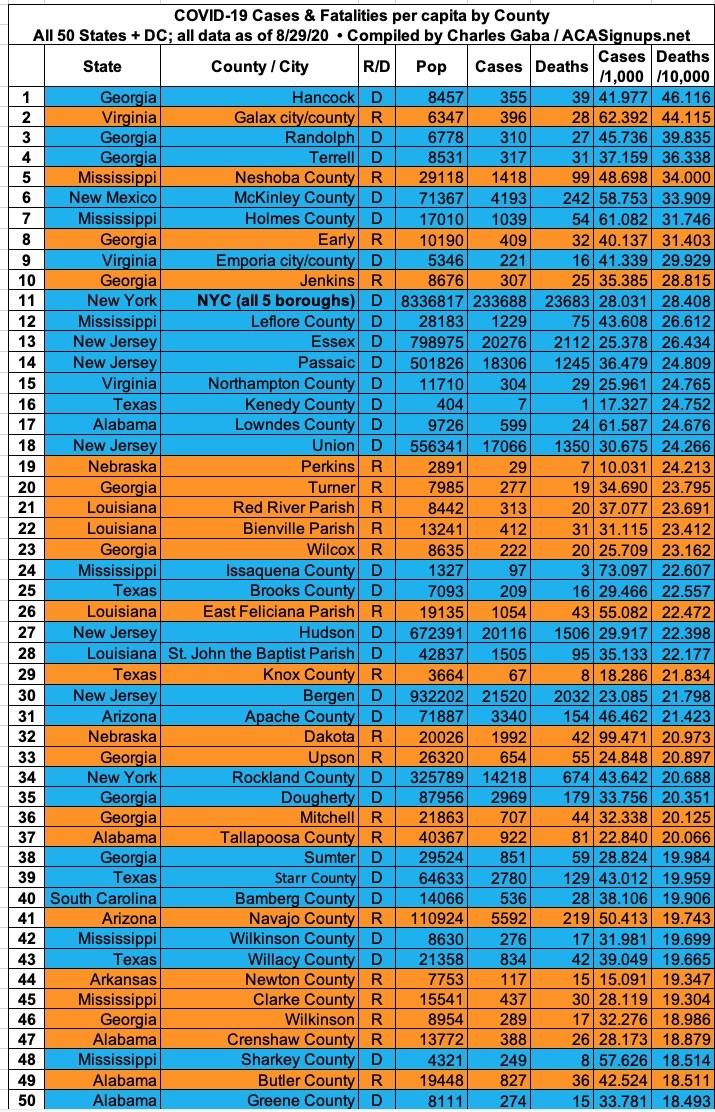 Here's the top 100 counties ranked by per capita COVID-19 fatalities as of Saturday, August 29th (click image for high-res version):