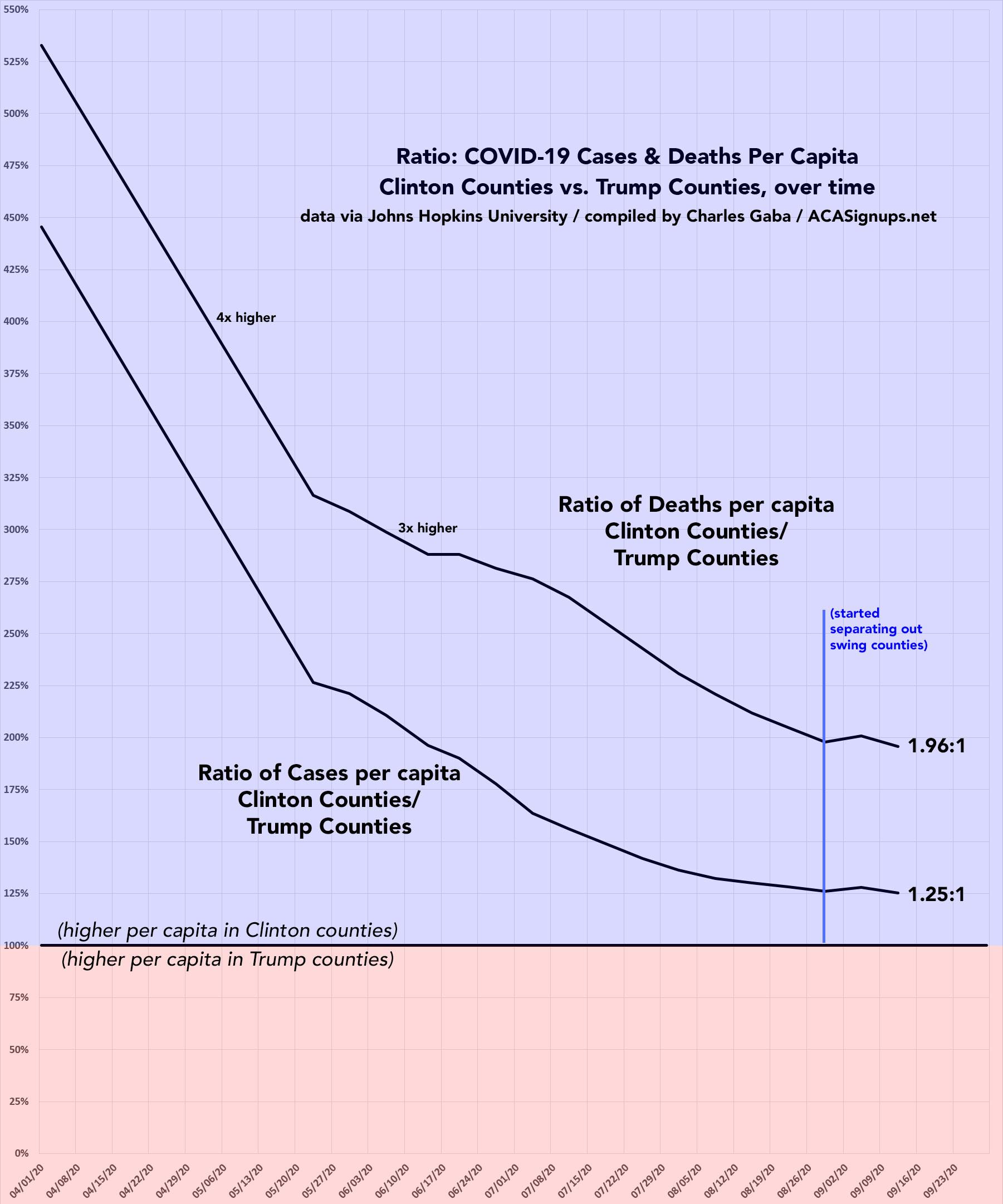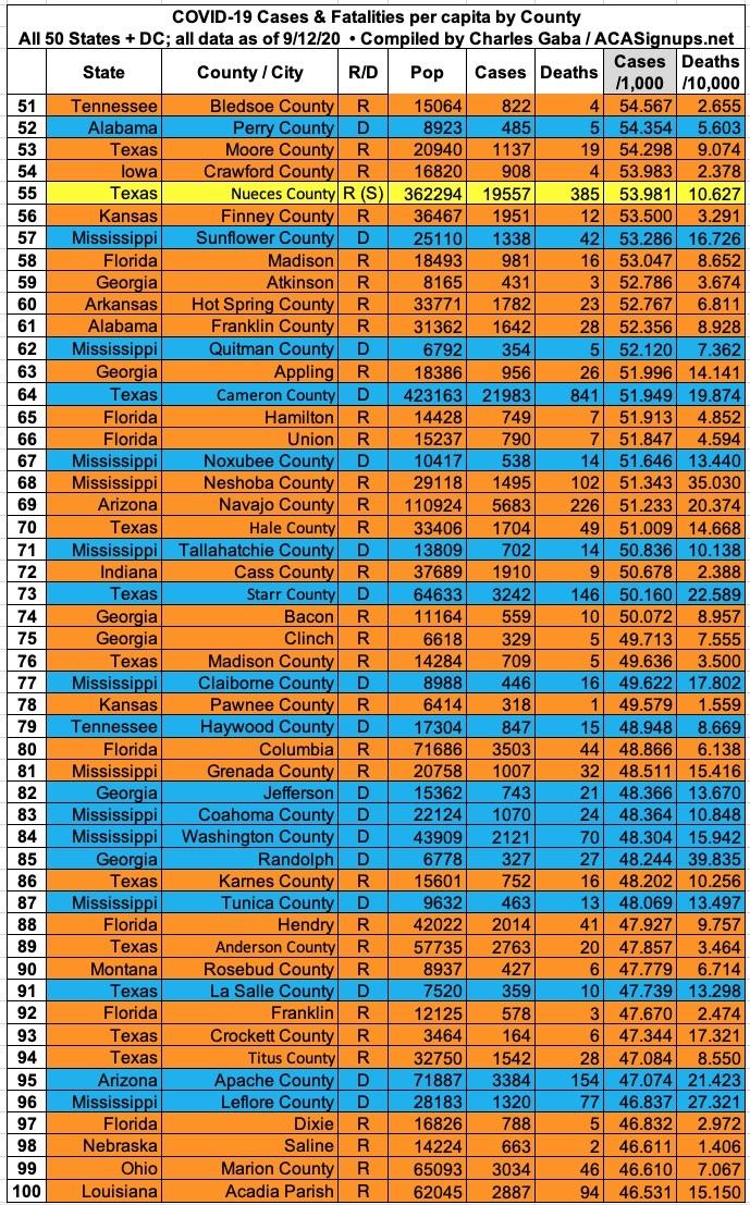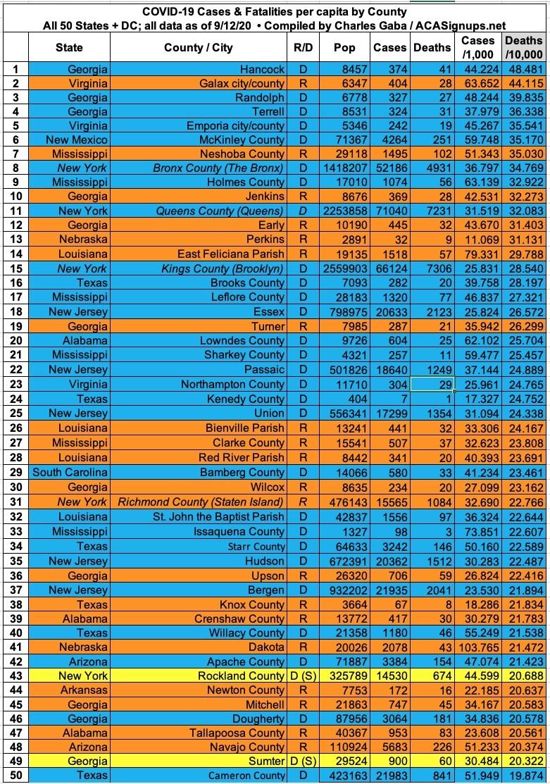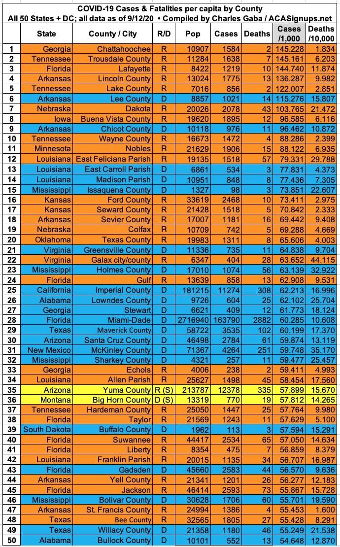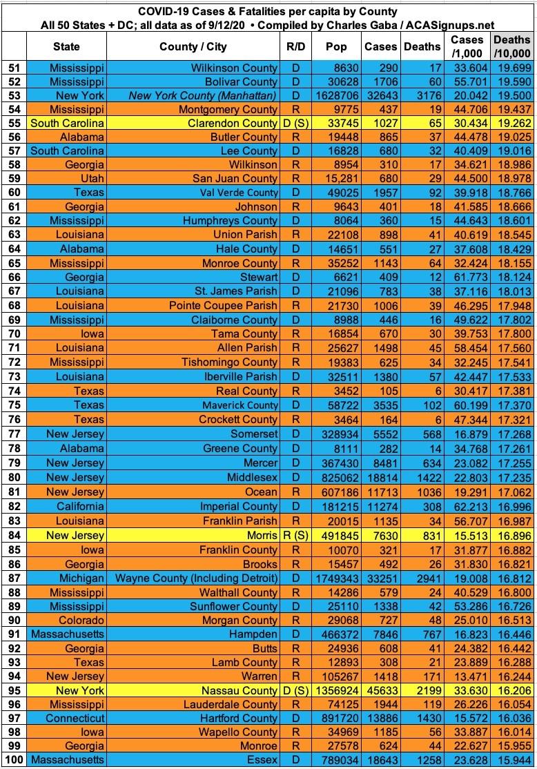 With these updates in mind, here's the top 100 counties ranked by per capita COVID-19 cases as of Saturday, September 12th (click image for high-res version). Blue = Hillary Clinton won by more than 6 points; Orange = Donald Trump won by more than 6 points; Yellow = Swing District