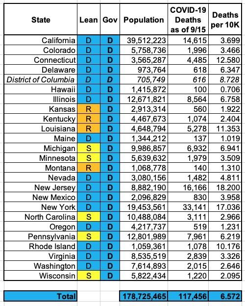 Yes, that's right: It's even closer...when you go strictly by whether a gven state has a Republican or Democratic governor, the Blue State death rate is just 26% higher than in the Red States.