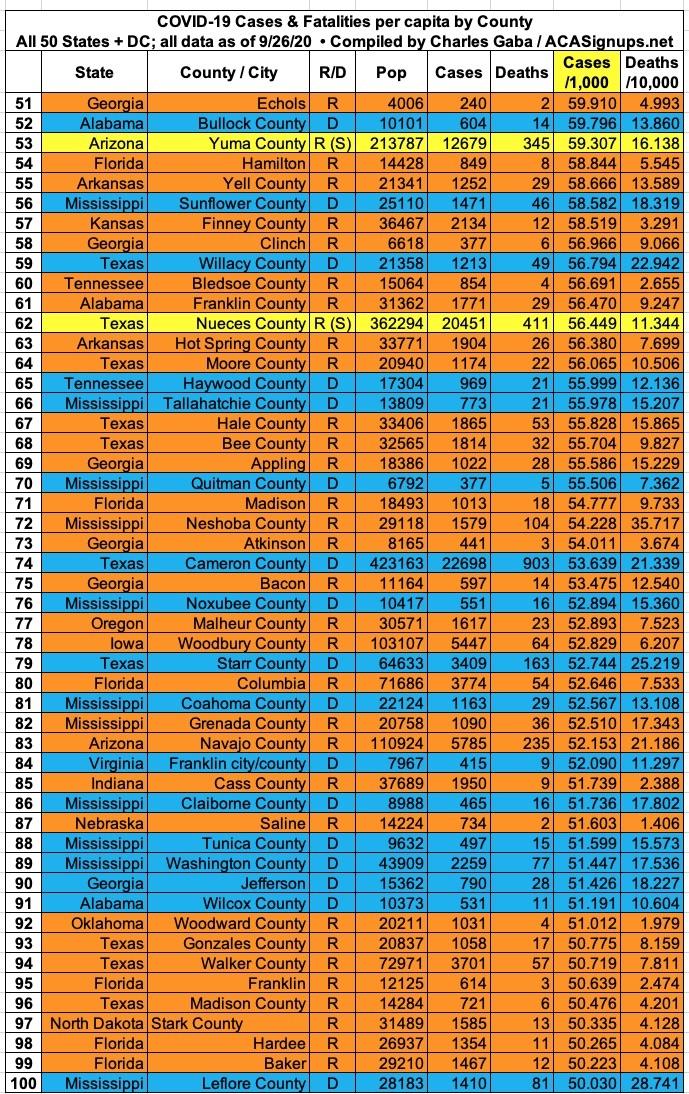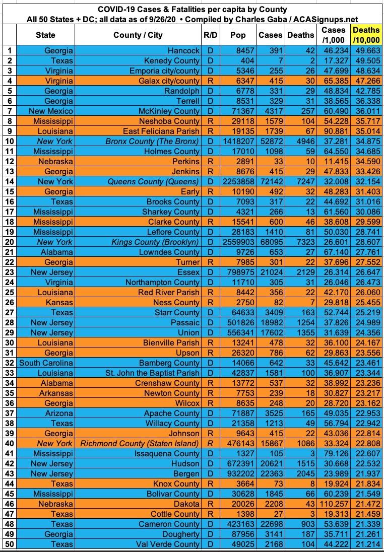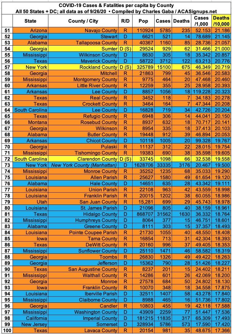 With these updates in mind, here's the top 100 counties ranked by per capita COVID-19 cases as of Saturday, September 26th (click image for high-res version). Blue = Hillary Clinton won by more than 6 points; Orange = Donald Trump won by more than 6 points; Yellow = Swing District