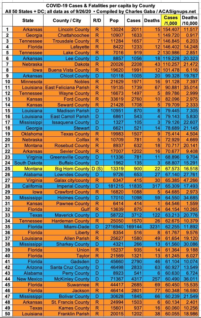 Here's the top 100 counties ranked by per capita COVID-19 fatalities as of Saturday, September 26th (click image for high-res version):