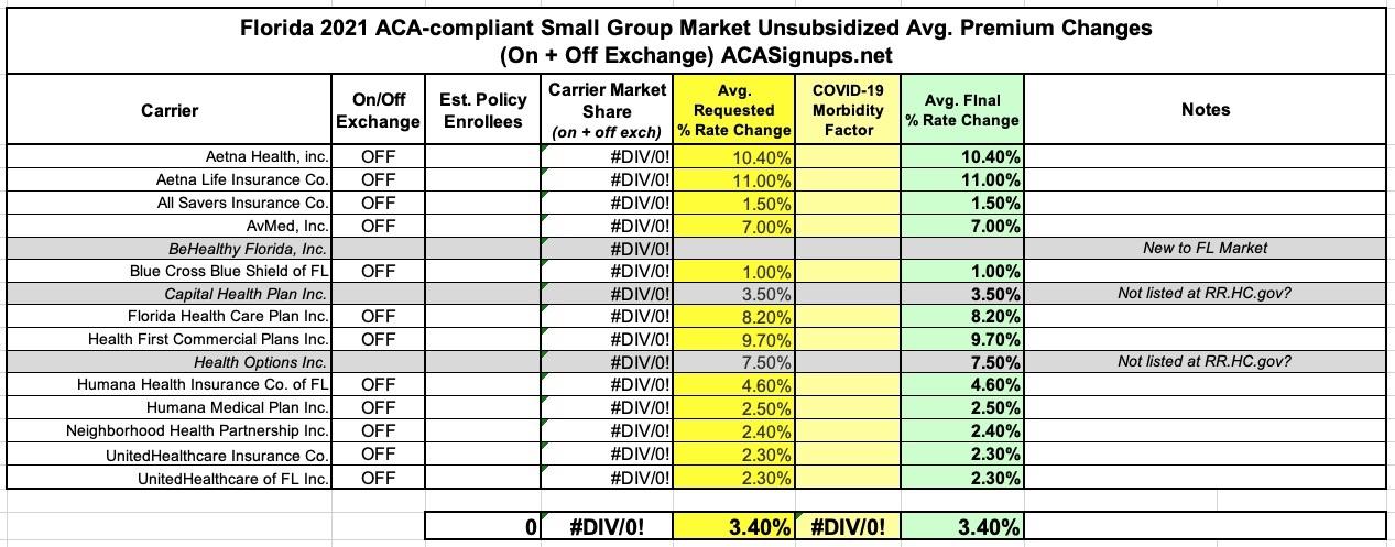 Back in late August, the Florida Office of Insurance Regulation posted preliminary 2021 individual & small group market rate filings. At the time, the weighted average increases were around 1.8% on the individual market and 3.3% for small group plans. Unfortunately, the actual enrollment data for each carrier is protected as a trade secret in Florida, but the FLOIR did post those weighted statewide averages.