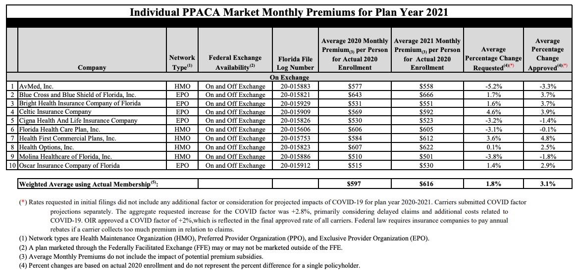 The Florida Office of Insurance Regulation (OIR) announced today that premiums for Florida individual major medical plans in compliance with the federal Patient Protection and Affordable Care Act (PPACA) have been approved for the 2020-2021 plan year. Following OIR’s rate filing review, the average statewide approved rate change on the Exchange is +3.1 percent, beginning January 1, 2021.