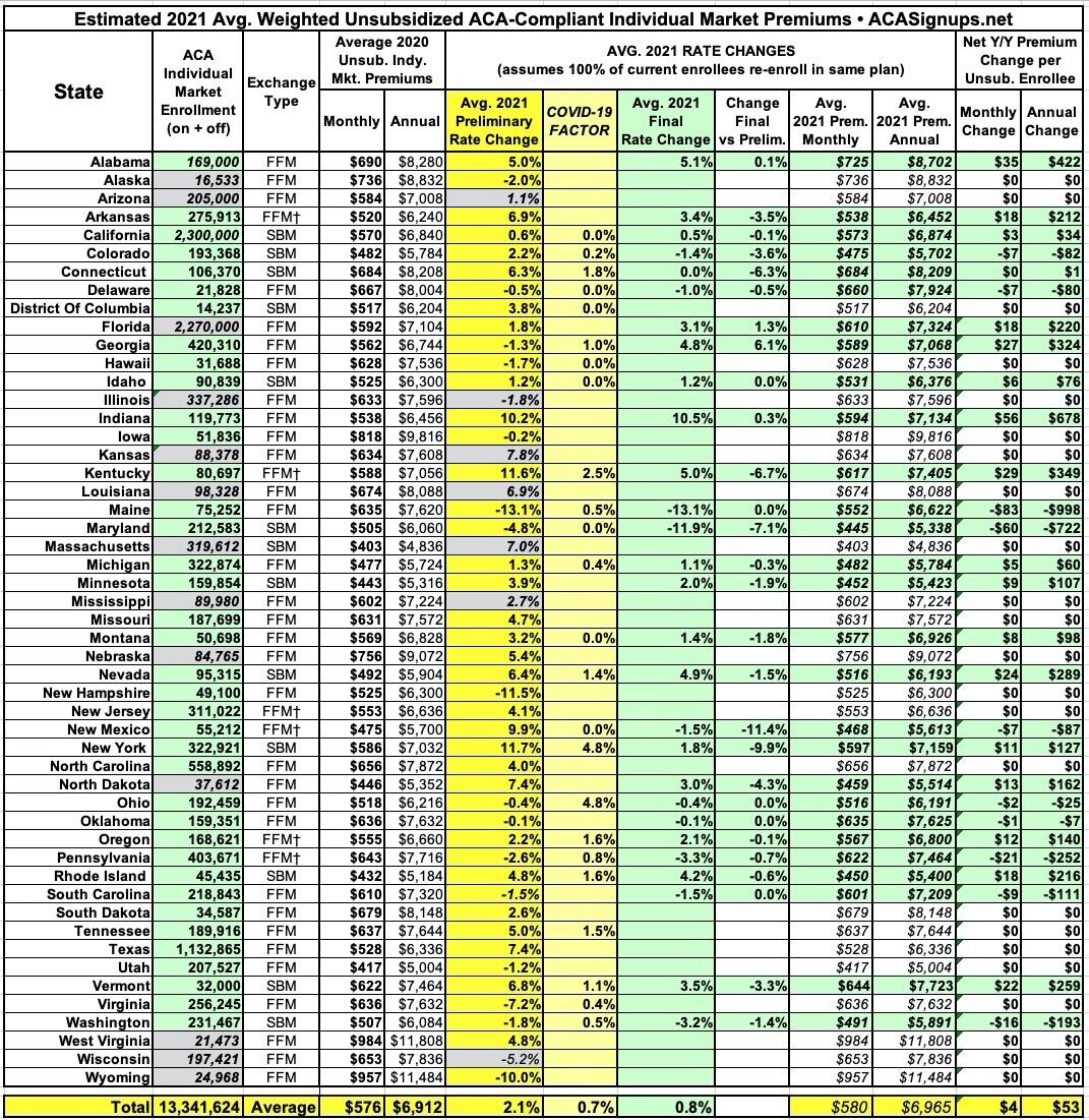 Without that number, I have no way of running weighted averages for that state's individual market; those are listed in grey below. In a few cases (like Florida), the state insurance dept. actually provided the weighted average but I still had to guess at the total enrollment number (also in grey).